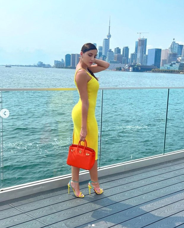 Nora posted sizzling snaps from her visit to Canada, dressed in a beautiful bright yellow dress. The midi dress featured a black slit and beautifully hugged her curves. Nora styled the look with soft makeup and side parted hair in a ponytail. She completed the look with multi colored strappy heels from Christian Louboutin.